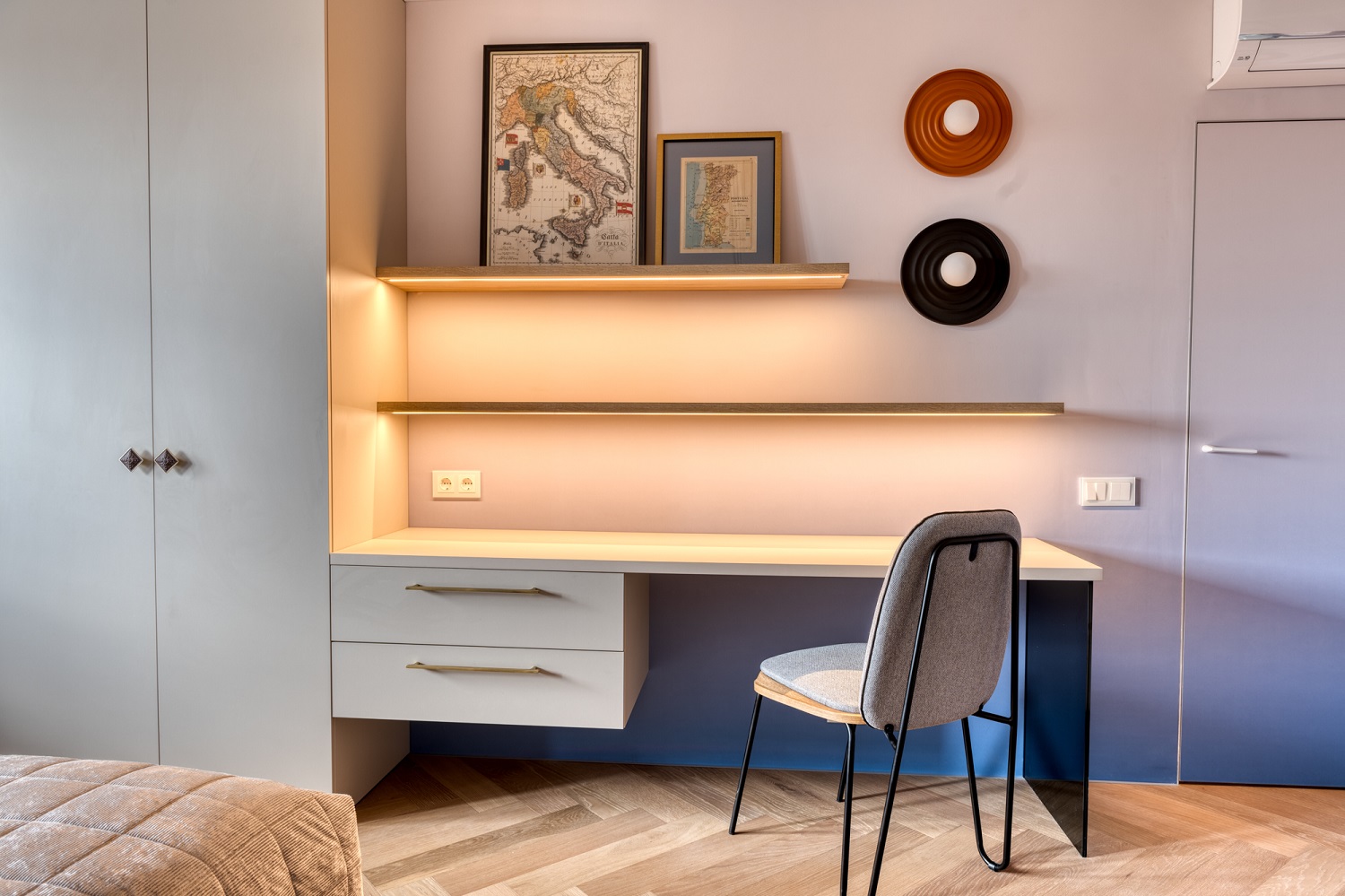 Для реализации проекта спальни дизайнер Марина Кутузова выбрала кварцевый паркет Дуб Лимба. Нейтральное светлое дерево стало идеальной платформой для реализации задумки с чёрными акцентами и контрастной стеной с каллиграфией, вокруг которой и построен весь интерьер.