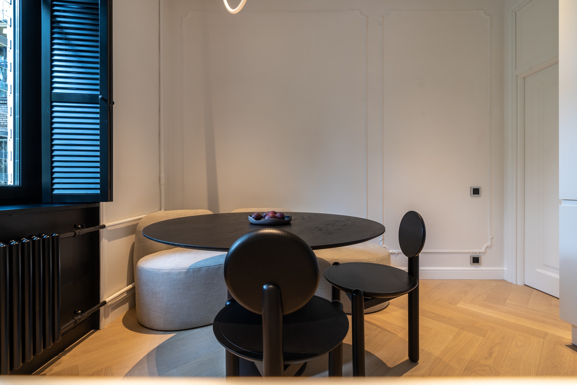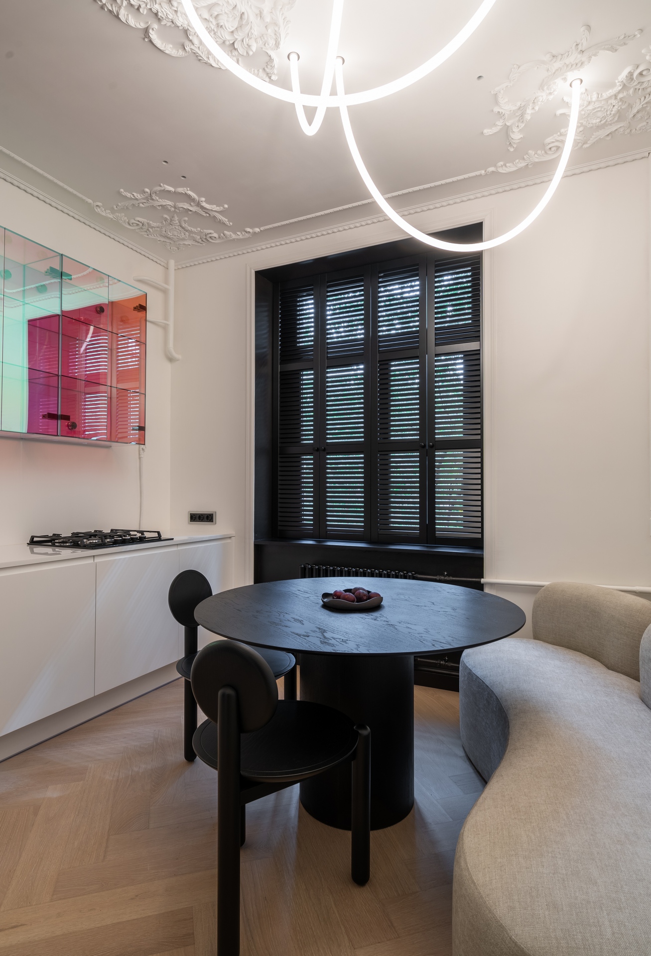 Контрастную чёрно-белую кухню разбавили лепной декор и уютный пол из натурального дерева, уложенный английской ёлочкой — кварцпаркет Quartz Parquet Дуб Испанский 33-404