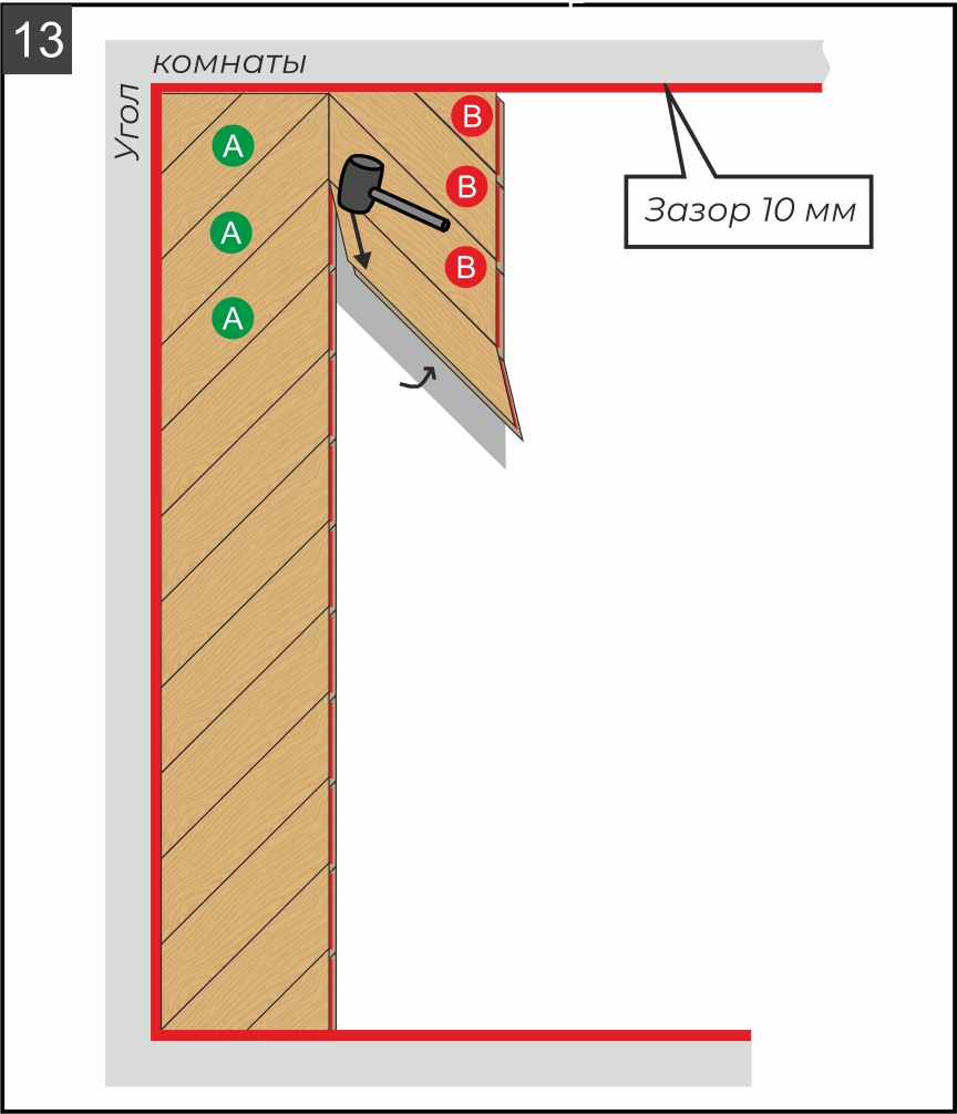 10.2. Продолжайте монтаж плашек «В», защёлкивая замки под углом до щелчка. Тщательно проверяйте стыки между плашками на отсутствие зазоров (особенно на внутренних углах) и контролируйте совпадение вершин плашек с соседними рядами после добавления каждой следующей плашки, при необходимости подбивайте их при помощи киянки и подбойника (рис. 13). Соблюдайте плотные и чёткие стыки всех плашек: даже мелкие расхождения при сборке создают накопительный эффект и приводят к смещениям плашек и другим ошибкам монтажа.
