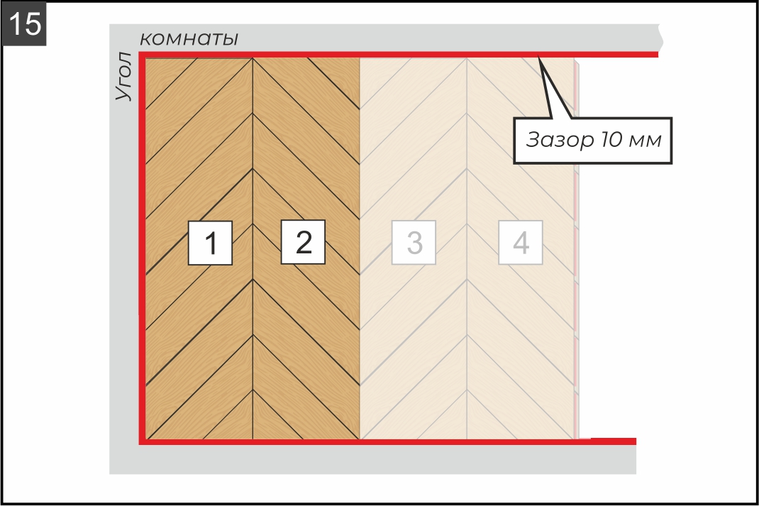 9.2. Отрежьте край ряда по указанной на рисунке красной линии (она формируется в зависимости от левого угла комнаты). Исходя из расчетов (см. рисунок 5) при необходимости подрежьте плашки по длине. В зависимости от типа пилы, которую вы используете, разберите плашки и отпилите каждую по отдельности или сделайте это уже в сборке, предварительно наметив линию при помощи угольника и карандаша.