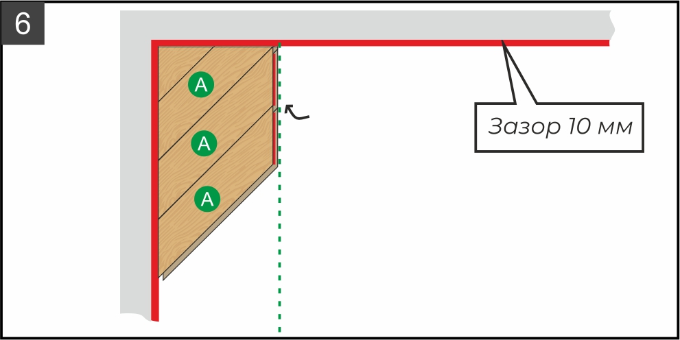 6.1. Основные монтажные деформационные зазоры необходимо предусмотреть в местах стыка края покрытия и стен, а также в местах стыка с другими напольными покрытиями и всеми выступающими из основания пола конструкциями и элементами (трубами, дверными и оконными рамами, лестницами, колоннами, перегородками, порогами, любыми крепежными элементами и недвижимыми элементами мебельных конструкций, кухонь и кухонных островов, встроенной мебели и т.п.).